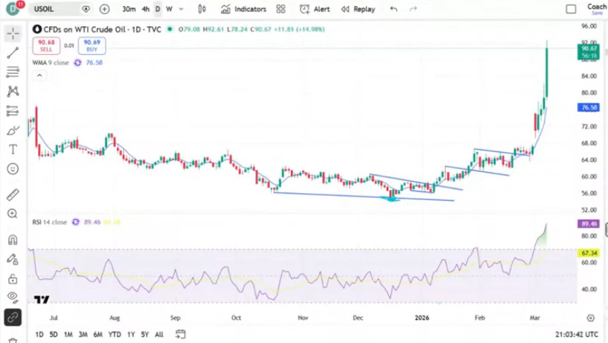 Oil was up 35% this week, finishing yesterday above $90 a barrel. If you’ve been watching Dale’s Talking Markets residency for a while, you’ll know his target over the past few months for oil has been $78, which we blew through early in the week. And that target was without the effective closure of the Strait of Hormuz (which he has also been worried about).