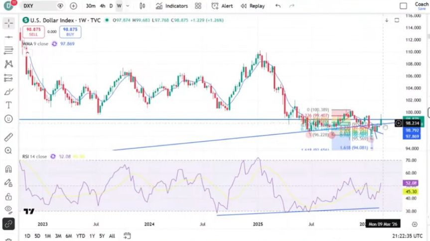 Dale has been looking for a move to 103 in the DXY over the longer-term - though he went home short the dollar last weekend. “I said if they do attack this weekend, I have to prepare to reverse out of my shorts, because if we get over 98, we’re going to have a breakout,” he said. “On Sunday night, the dollar didn’t kick in very fast, and I had a chance to reverse out.”