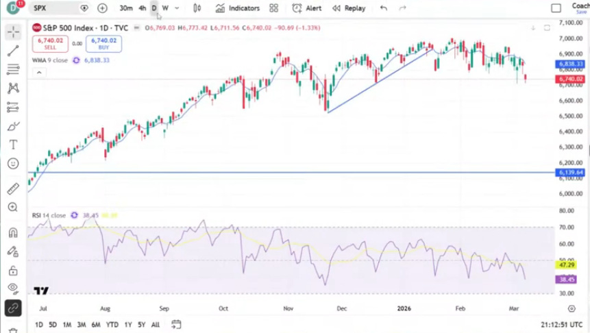 The S&P has been in a range since at least the beginning of the year, and this week we finally closed under it. Now, Dale sees 6,500 potentially happening in a hurry. And if it breaks under that level, it could go to a target Dale’s been talking about for a while: 6,100, which he sees a good chance of happening “maybe into April.” That could potentially be a buying opportunity.