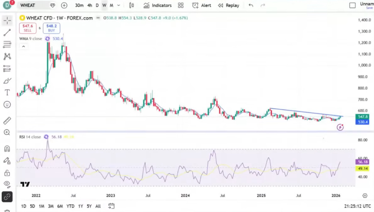 Wheat: “We’re on the verge of a weekly breakout off a 3-year base,” he said. “There’ve been many false starts, but the expression is, the longer the base, the bigger the launch into space… The fundamentals are terrible but there are so many things that could go wrong. So I think this is going to become the silver of the grain complex.”