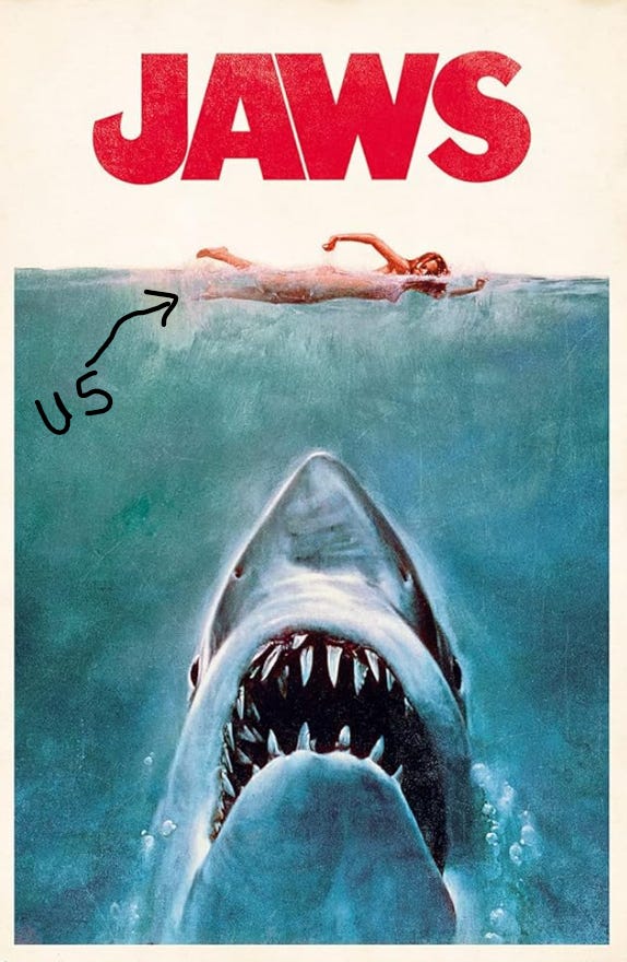 “It's like the movie poster of Jaws of the girls swimming and the sharks coming up underneath her,” Luke said. Oh. Great.